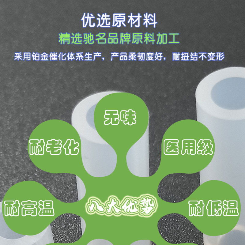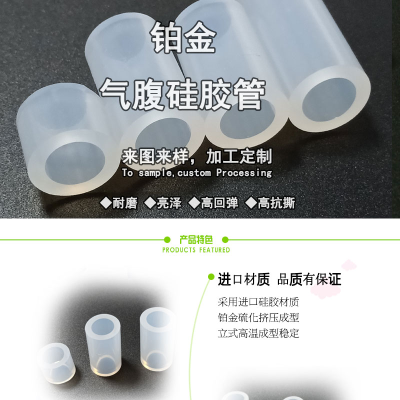 鉑金氣腹機硅膠管:采用進口硅膠原材料,連續(xù)擠出一次成型,內(nèi)壁平滑;常規(guī)硬度60度(邵氏硬度30-90度);耐溫范圍廣(-50~+280℃),可以適應(yīng)高、低溫設(shè)備需求,并耐老化。常規(guī)PE袋+紙箱包裝,特殊要求可按客戶標(biāo)準(zhǔn);產(chǎn)品符合SGS、FDA、LFGB、生物相溶性等;用于呼吸機、麻醉機、制氧機、輸氧機管道等。