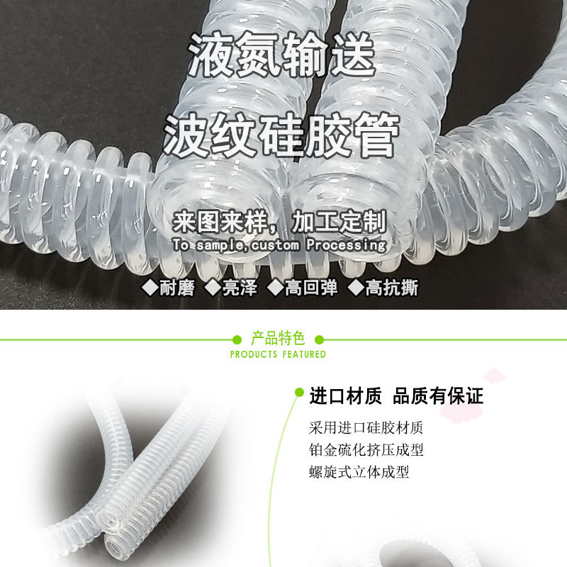 液氮輸送波紋硅膠管:采用進口硅膠原材料,連續(xù)擠出一次成型,內(nèi)壁平滑;常規(guī)硬度70度(邵氏硬度30-80度);耐溫范圍廣(-50~+280℃),可以適應(yīng)高、低溫設(shè)備需求,并耐老化。常規(guī)PE袋+紙箱包裝,特殊要求可按客戶標(biāo)準(zhǔn);產(chǎn)品符合SGS、FDA、LFGB、生物相溶性等;用于呼吸機、麻醉機、制氧機、液氮輸送管道等。