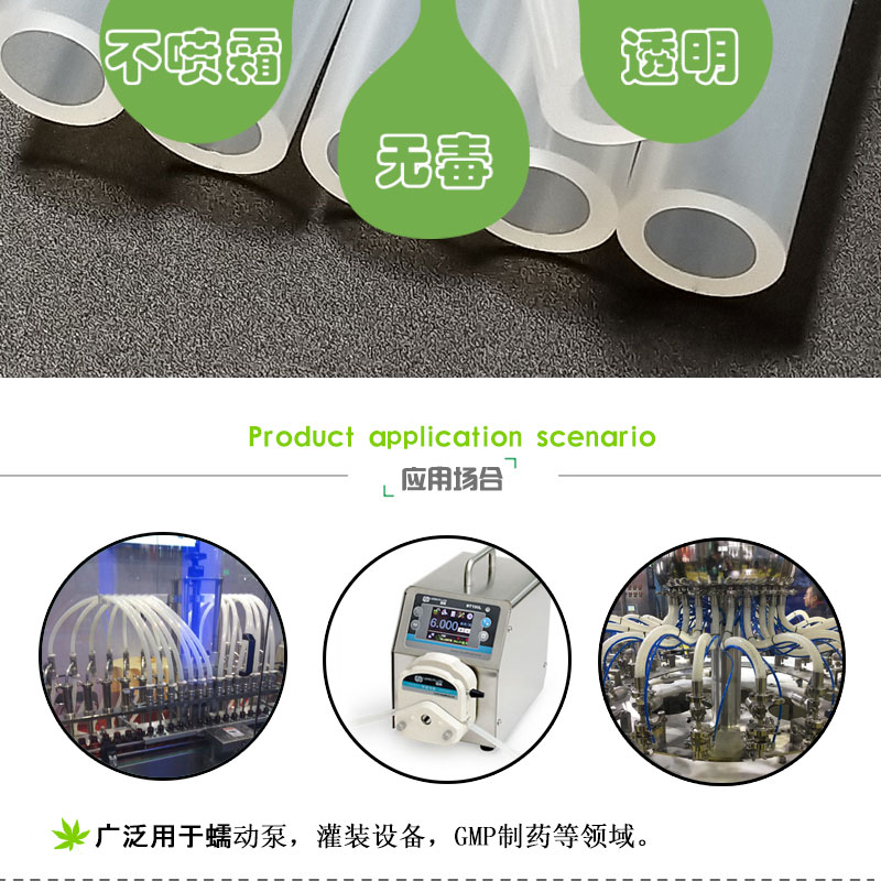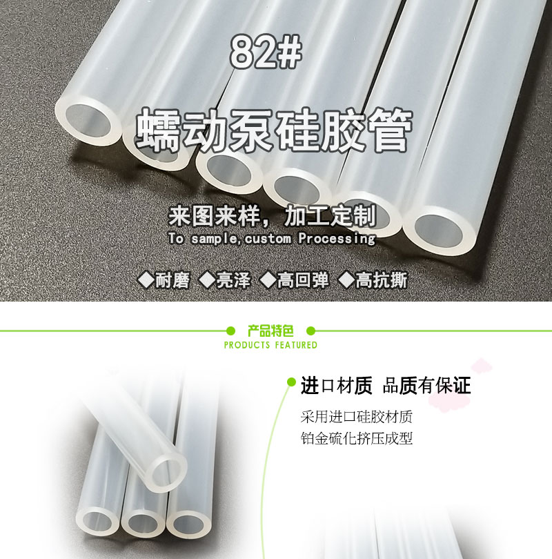 82#蠕動(dòng)泵硅膠管:采用進(jìn)口硅膠原材料,連續(xù)擠出一次成型,管口程圓形不扁,形變小析出物少,壁厚均勻度精密;常規(guī)硬度60度(邵氏硬度值20-80度);耐溫范圍廣(-50~+280℃)。常規(guī)PE袋+紙箱包裝,特殊要求可按客戶(hù)標(biāo)準(zhǔn);產(chǎn)品符合SGS、FDA、LFGB、生物相溶性等;用于灌裝機(jī)、蠕動(dòng)泵專(zhuān)用、醫(yī)療醫(yī)用器械、輸液泵等。