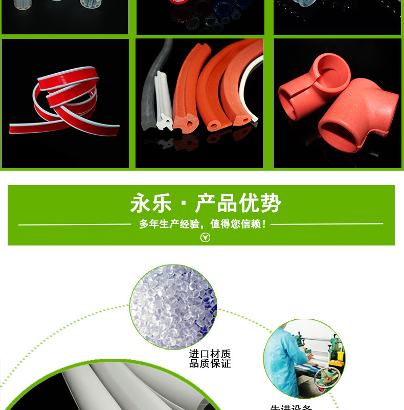 擠出硅橡膠制品廠家名稱 | 永樂橡塑 | 產(chǎn)品材質 | 硅橡膠 | 產(chǎn)品耐溫 | -50~280 |